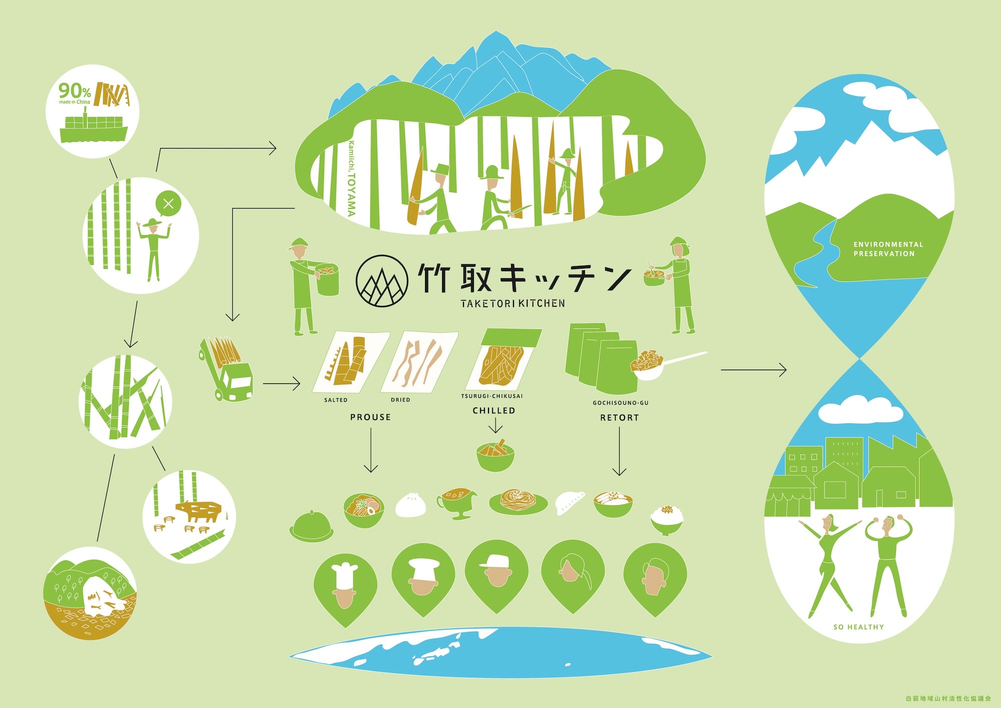 この環境負荷の少ないメンマ・竹菜が流通することにより、山村地域に雇用を生み、このサイクルを持続していくための体制が整っていきます。